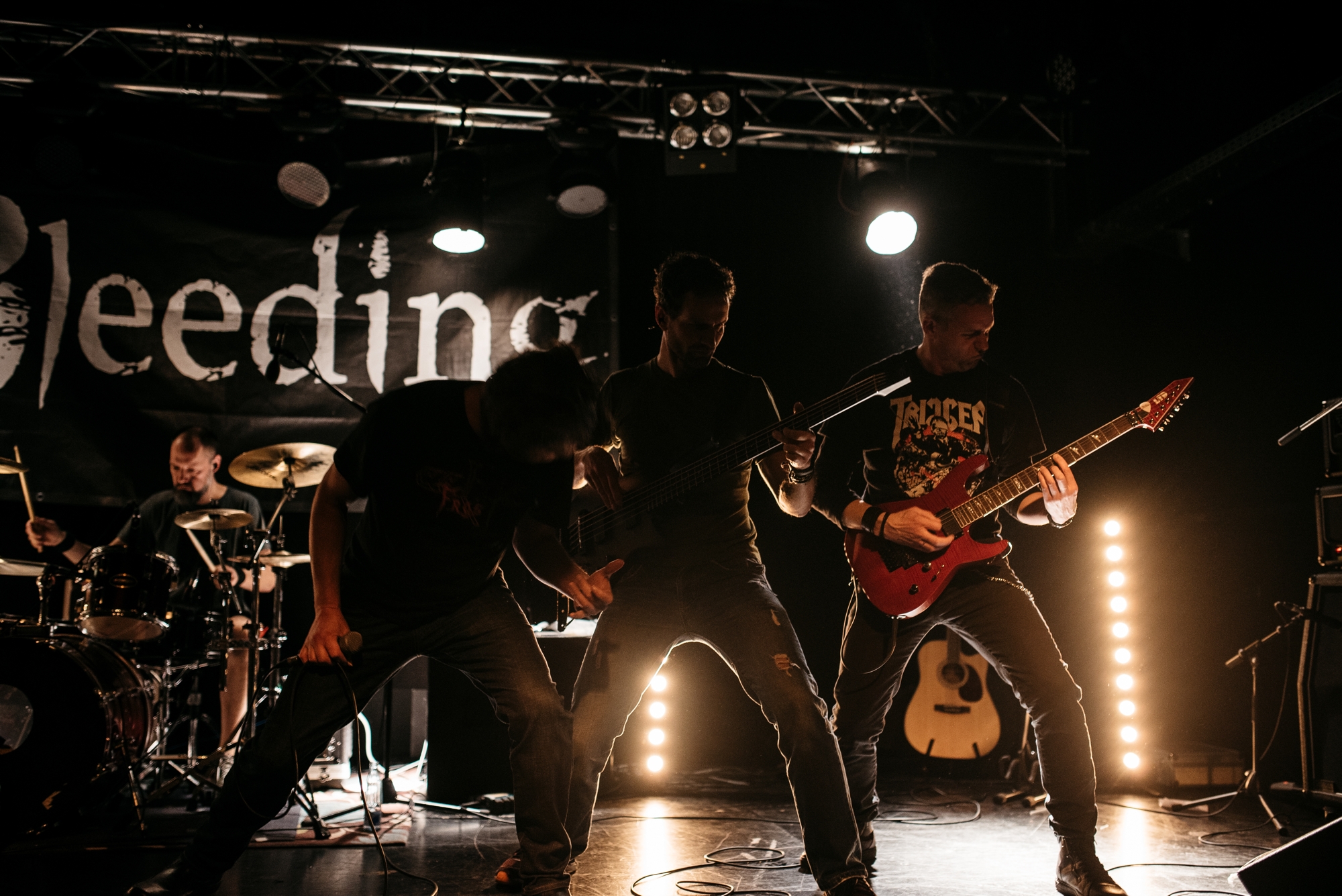 ...ist nicht nur eine Textzeile aus einem Song einer Band aus Stade bei Hamburg, sondern könnte auch für die Entstehung der Band selber stehen. Haye Graf (vocals, keys) und Jörg von der Fecht (guitar, bass, programming) haben bereits früher bei Forms in combat zusammen gespielt, während Marc Nickel (guitar, bass) bei der befreundeten Band Kurai Tanima spielte. Nach einigen Jahren des Experimentierens in verschiedenen Musikprojekten und teilweise sogar der zwischenzeitlichen kompletten Aufgabe des aktiven Musikmachens, entschlossen sie sich auf einem Psychotic Waltz Konzert im März 2011 dazu, nochmal alle kreativen Energien in ein neues gemeinsames Projekt zu stecken: BLEEDING war geboren! ![]() Die gleichnamige Demo EP wurde Juni 2012 veröffentlicht und enthielt vier Songs. Sie spiegeln das wieder, was Bleeding mit ihrer Musik erreichen wollen: Spaß an der eigenen Musik, ohne sich limitierende Genregrenzen zu setzen. So findet sich auch in ihnen ein recht großes Spektrum verschiedener Musikstile und Stilmittel wieder, wie Thrashmetal, Progmetal oder dezente Electroparts, die trotz aller vordergründigen Unterschiede harmonisch nebeneinander existieren und den Songs einen hohen Wiedererkennungswert geben.